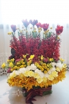 | 白色海芋 黃色素心蘭 樹蘭花 小紫計 橘色宮燈 胭脂紅玫瑰 |
